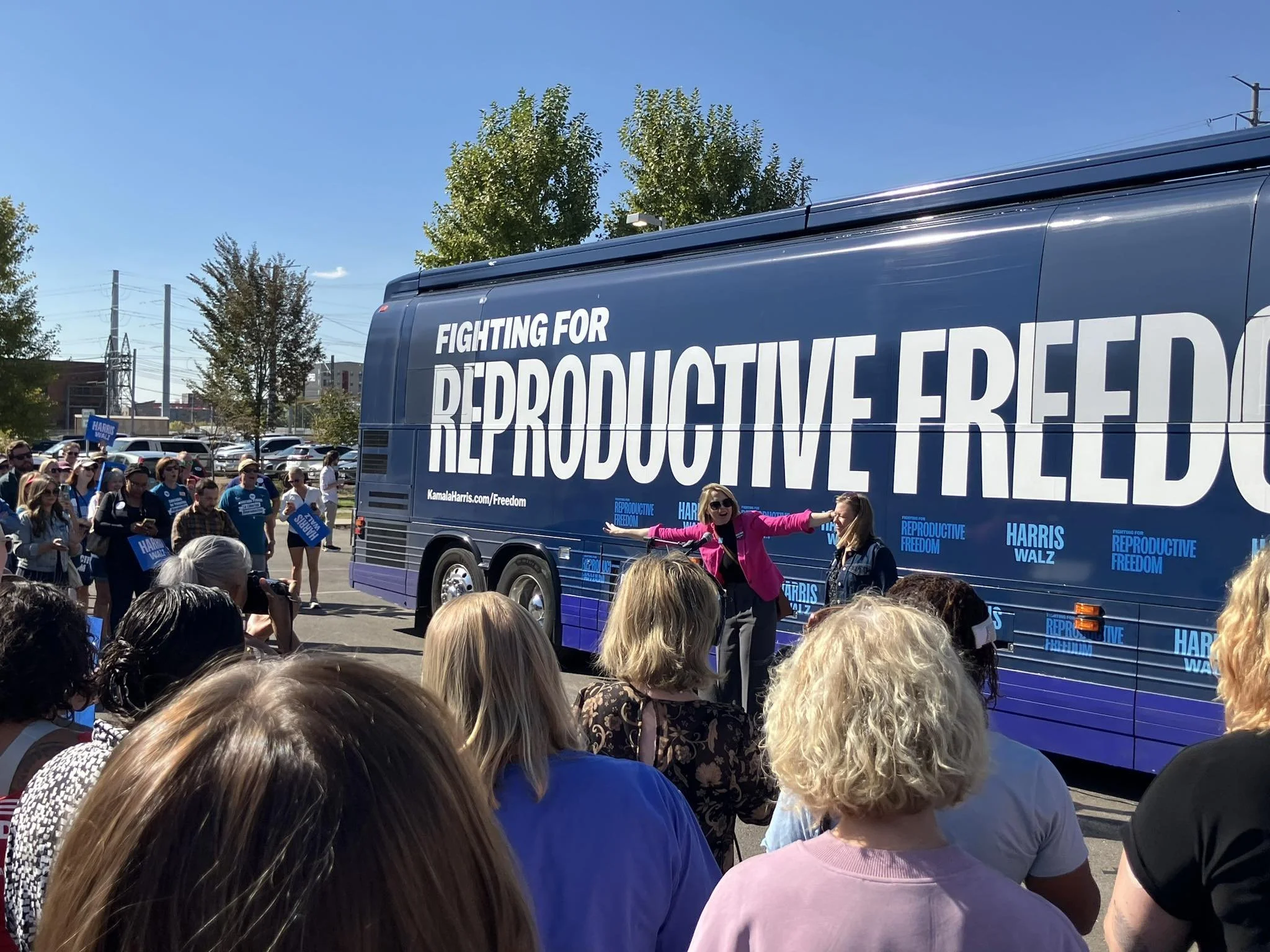 Kayla rallying a crowd as Colorado State Director for the Harris-Walz campaign in fall 2024